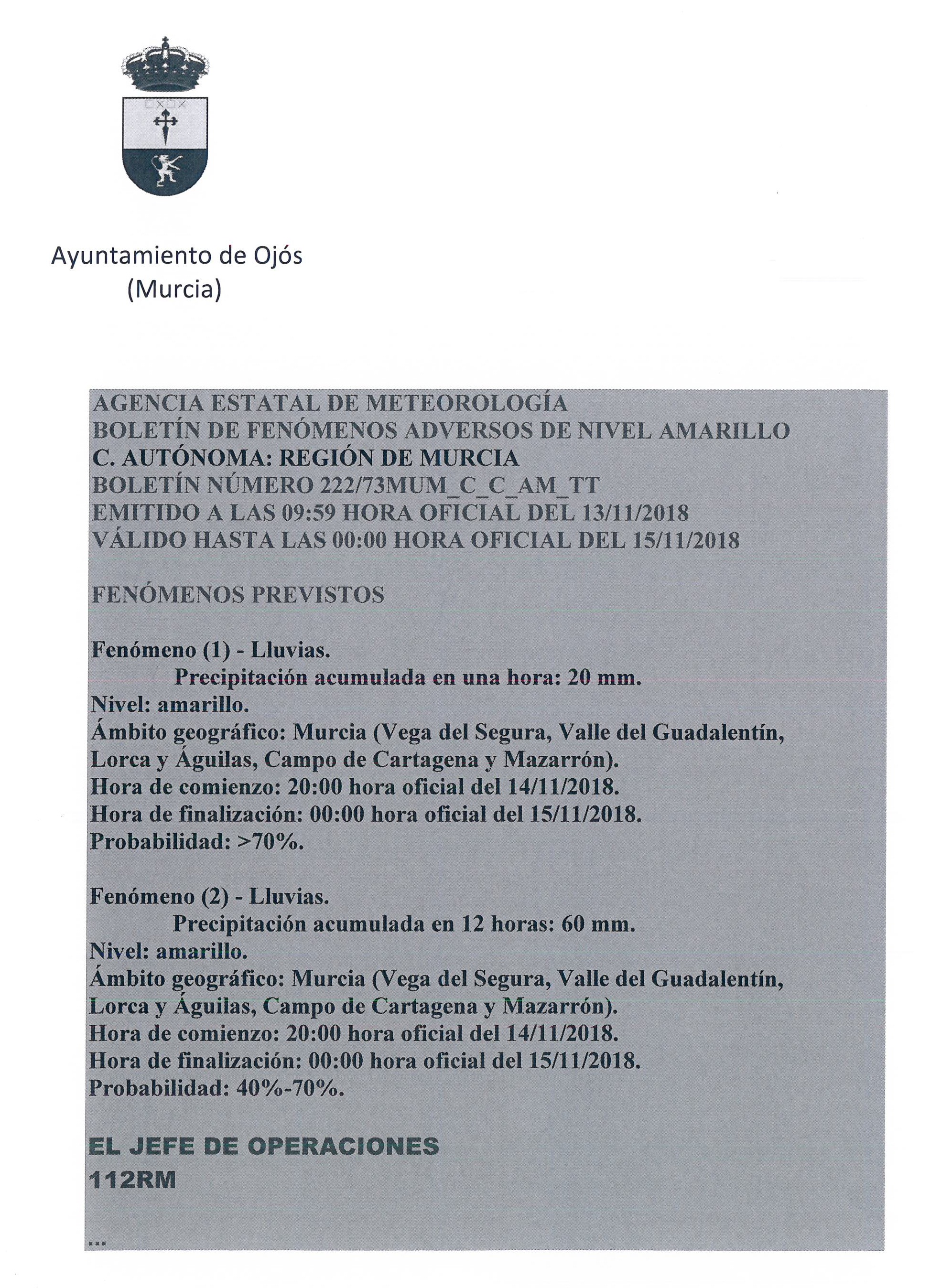 BOLETÍN DE FENÓMENOS ADVERSOS DE NIVEL AMARILLO Detalles Categoría de nivel principal o raíz: 8.-Información y Atención al Ciudadano Categoría: 8.3.-Participación Ciudadana Publicado: Martes, 13 Noviembre 2018 20:43 Visto: 26425 Anterior Siguiente